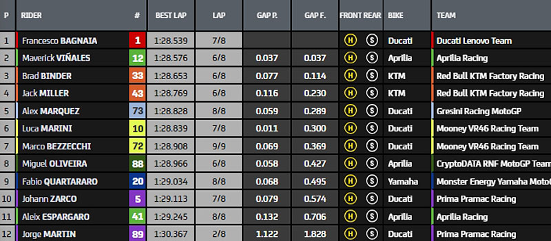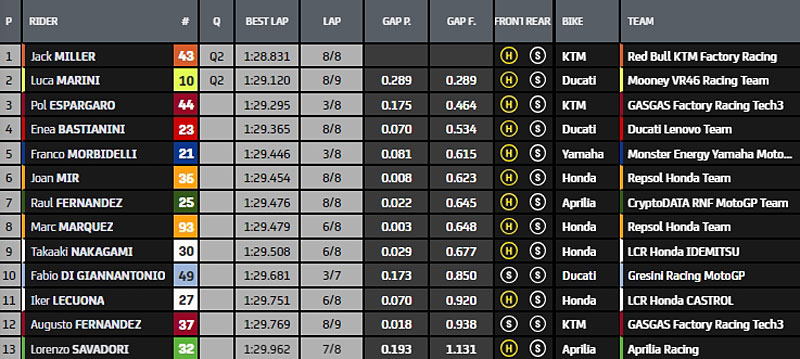 À la fin du premier run, on trouve donc Maverick Vinales, Francesco Bagnaia, Fabio Quartararo, Brad Binder, Marco Bezzecchi, Alex Márquez, Johann Zarco, Jack Miller, Miguel Oliveira, Aleix Espargaro, Jorge Martin et Luca Marini.