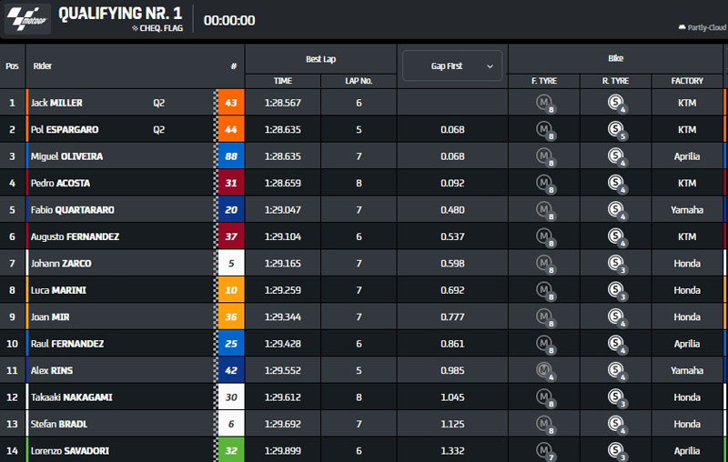 Le top10 se compose en vue de la future grille de départ : Martin, Bagnaia, MMarquez, AEspargaro, Miller, Vinales, Bastianini, Bezzecchi et Pol Espargaro.
