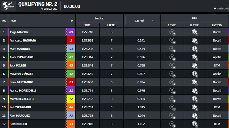 Q2 1’28.539 Francesco Bagnaia (Voir ici)  1’27.748 Jorge Martin