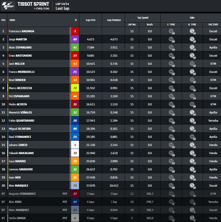 Sprint Bagnaia, Binder, Martin (Voir ici)  Bagnaia, Martin, Aleix Espargaro