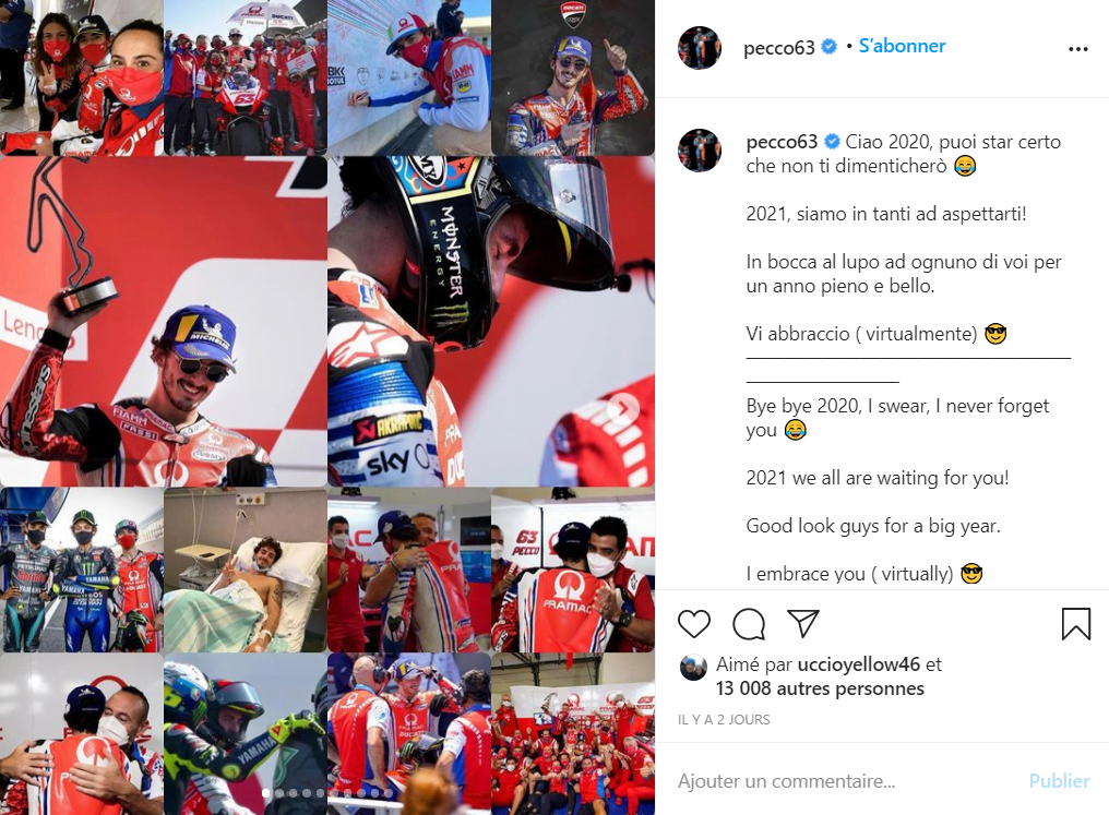 Pecco Bagnaia n’avait pas vraiment convaincu lors de sa première saison en MotoGP sur la Ducati Pramac. En 2020, il a été en revanche suffisamment convaincant pour se retrouver en 2021 comme pilote au sein de l’équipe officielle de la marque de Borgo Panigale. Il sera aux côtés d’un pilote qu’il connait très bien puisqu’il s’agit de Jack Miller qui a suivi la même route de Pramac à l’usine que lui. Il retrouvera aussi Valentino Rossi sur la piste, avec qui les relations auraient changé. Et ce n’est pas dû aux changements de couleurs du Doctor …