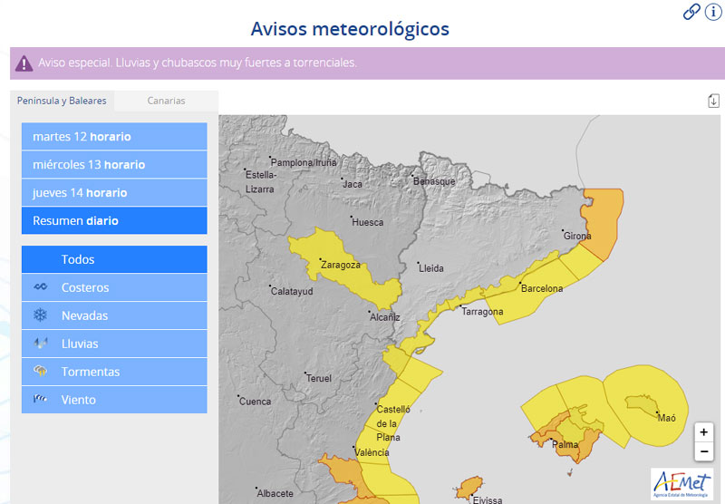 7.- Notification d’actions futures ou finales : L’AEMET actualisera ces informations demain et recommande un suivi détaillé et actualisé de la situation par le biais de ses prévisions et avertissements d’événements météorologiques défavorables sur www.aemet.es