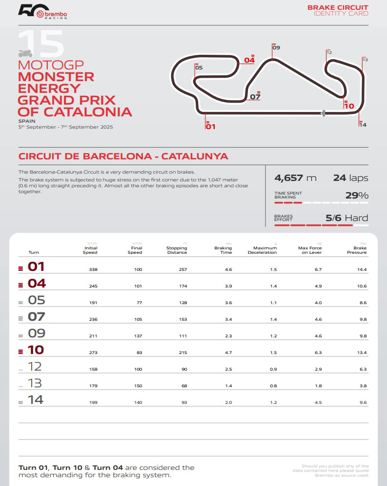 Le virage le plus exigeant du Circuit de Barcelona-Catalunya pour le système de freinage est le virage 1 : les motos MotoGP décélèrent de 338 km/h à 100 km/h en 4,6 secondes, parcourant 257 mètres, tandis que les pilotes exercent une charge de 6,7 kg sur le levier de frein. La décélération atteint 1,5 g, la pression du liquide de frein Brembo atteint 14,4 bars et la température des disques en carbone grimpe à 700 °C.