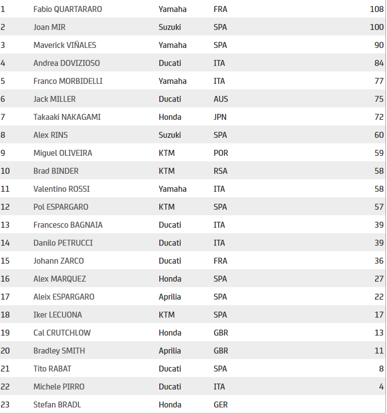 Valentino Rossi est déçu d’avoir raté une fois encore un possible 200è podium alors que Morbidelli n’a pu tenir le podium après avoir mené la course. Il finit quatrième tandis que Miller ferme le top 5 après une lutte finale intense contre son équipier Bagnaia et Nakagami. On notera l’abandon sur chute d’Oliveira comme celle de Pol Espargaró, si bien que KTM ramène les points seulement grâce à Brad Binder, onzième derrière un Crutchlow qui est allé au bout de lui-même pour fermer le top 10…