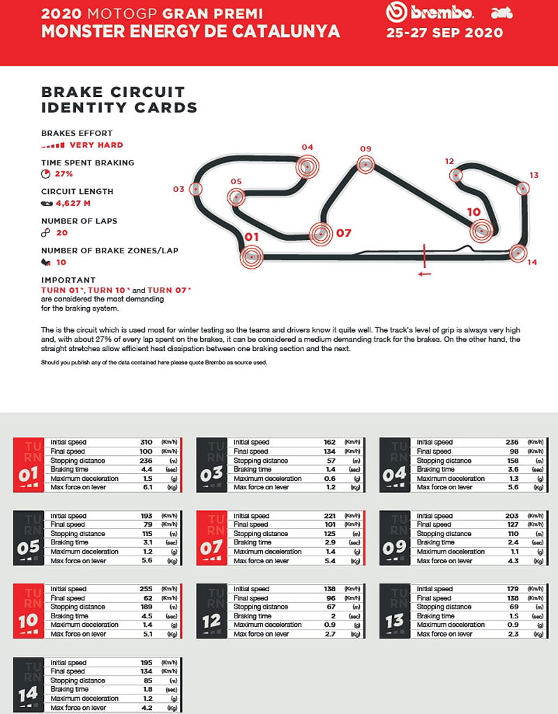 Selon les techniciens de Brembo, qui travaillent en étroite collaboration avec tous les pilotes du championnat du monde MotoGP, le Circuit de Barcelona-Catalunya est l’un des circuits les plus exigeants en matière de freinage. Sur une échelle d’indice de difficulté de 1 à 5, il a obtenu un 5, à égalité avec le Red Bull Ring.