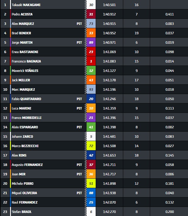 Martin reprend la main en 1.41.820s. Mais AMarquez lui répond et récupère ce meilleur chrono en 1.40.915s. Suivent: Martin, Bagnaia,   Vinales, Nakagami, Marini, AEspargaro, Binder, Quaratararo et Acosta complètent le top10