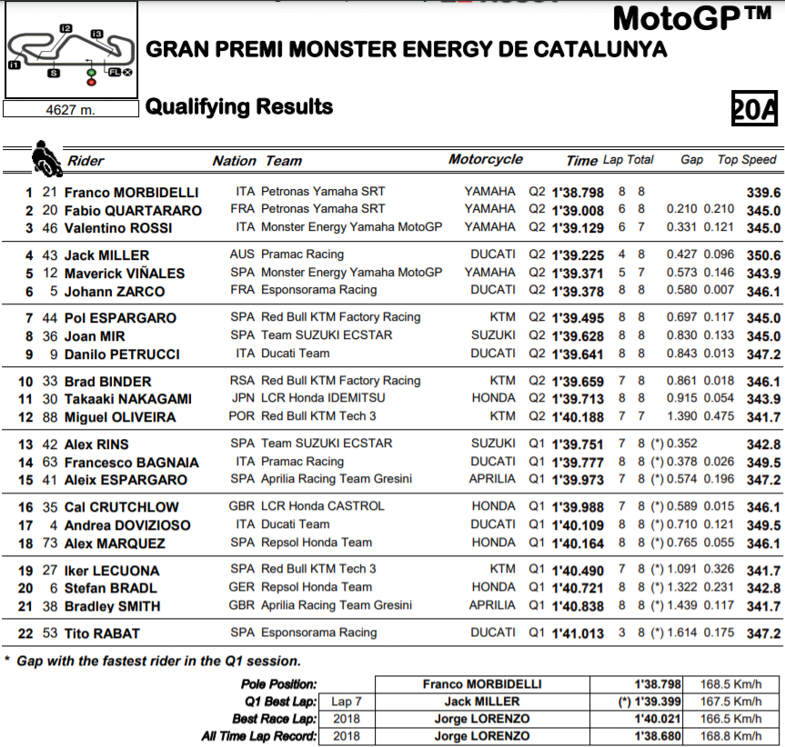 Brad Binder voit cependant un dimanche bien différent de ce samedi : « les Yamaha ont définitivement l’air solide en qualifications » dit Binder. « Mais j’espère que l’équilibre des pouvoirs changera un peu en course. J’ai vu sur la piste que les as de Yamaha laissaient tourner leurs pneus arrière à l’infini, car en qualifications, il n’est pas nécessaire d’épargner le pneu arrière. Mais ce sera différent dans la course ».