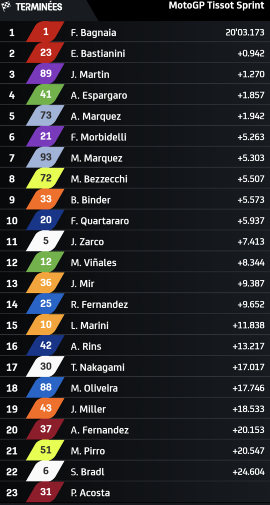 Quel départ ! Alors qu’on sait Bastianini en difficulté avec les premiers tours, surtout quand il part de loin, l’Italien a brillé dans les premiers instants, réalisant un holeshot depuis la huitième place sur la grille ! « Je ne m’y attendais pas parce que c’est une piste sur laquelle j’ai toujours souffert. Je pense que c’était le meilleur départ de ma carrière. Je n’ai jamais aussi bien démarré, puis je suis arrivé dans le premier virage avec détermination. Je savais que je pouvais entrer vite. » confiait-il dans les colonnes de GPOne.