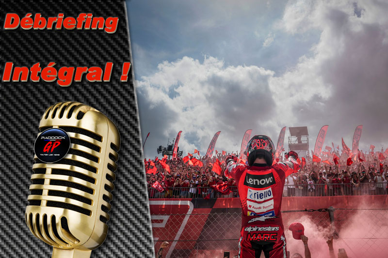 Marc Márquez : « Oui ! Je veux dire, c’était la dernière poussée, comme je l’ai dit. C’était la dernière fois que je poussais, mais aussi, quand vous suivez quelqu’un, la température de l’avant augmente. J’avais du mal, mais le problème, c’est que il m’a dépassé et pourquoi je ne pouvais pas le repasser. C’est parce qu’il était vraiment très bon dans les deux derniers virages. Moi, j’arrivais tard au point de freinage. Il était toujours très performant et arrivait très proche, il me dépassait, et ensuite il était super dans le virage 9, un autre point de dépassement au virage 10, et j’arrivais toujours en retard. Il n’y avait que la possibilité de récupérer du temps, mais pas de le dépasser. »