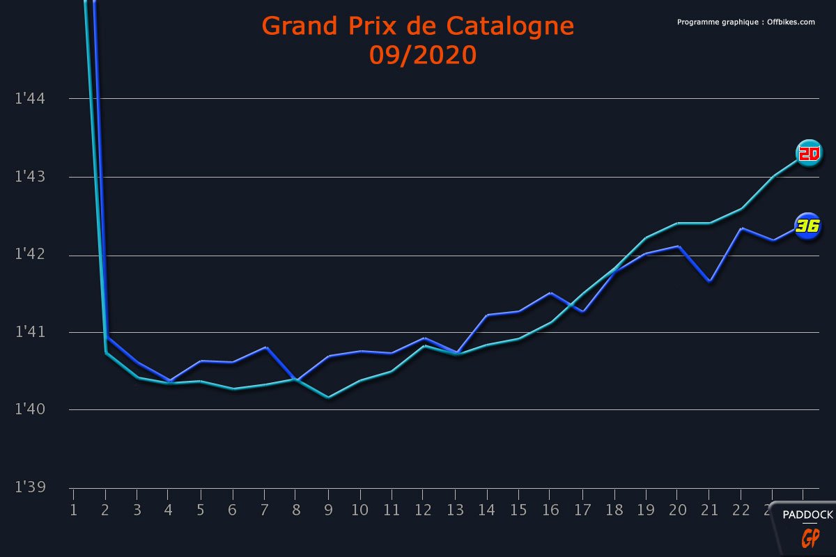 Quand Joan Mir a doublé Jack Miller au 16e tour, il s’est alors montré plus rapide que Fabio Quartararo mais n’a pu améliorer son rythme que pendant un tour, signe que si ses pneus se dégradaient moins vite que ceux du Français, ils se dégradaient quand même à chaque tour !