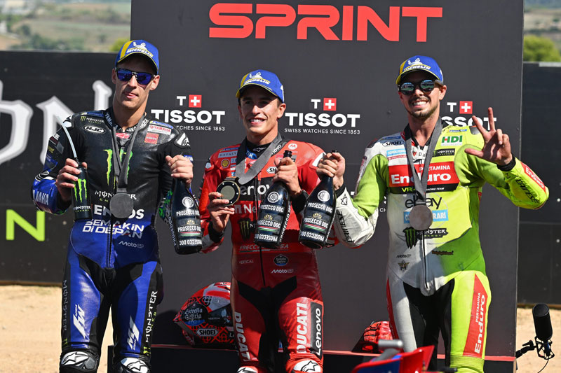 La Tissot Sprint, disputée par l’ensemble du plateau avec des pneus MICHELIN Power Medium à l’avant et Soft à l’arrière, a ensuite été remportée par Marc Márquez (Ducati Lenovo Team) en 19’58.946, devant Fabio Quartararo (Monster Energy Yamaha MotoGP) et Fabio Di Giannantonio (Pertamina Enduro VR46 Racing Team). Parti de la troisième position sur la grille, l’octuple champion du monde espagnol a réalisé une prestation solide, avec un chrono global inférieur de plus d’une seconde et demie à l’édition 2024.
