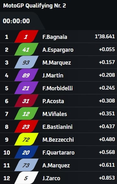 La deuxième Aprilia passe aussi directement en Q2, celle de Maverick Viñales, sixième. La RS-GP#12 de l’entreprise vénitienne a précédé les frères Alex et Marc Marquez, la KTM du Team GASGAS Tech3 de Pedro Acosta et le dernier pilote à accéder directement à la phase finale de qualification, Enea Bastianini, Ducati Factory.