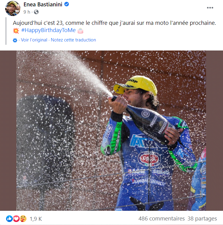 Bastianini a fêté son anniversaire ce mercredi. Et ça lui a donné une idée : « cela fait maintenant 23 ans, comme le numéro que j’aurai sur ma moto l’année prochaine », écrit-il sur sa page Facebook. Le champion du monde Moto2 fera ses débuts en MotoGP à l’âge de 23 ans, à juste titre avec le numéro de départ 23…