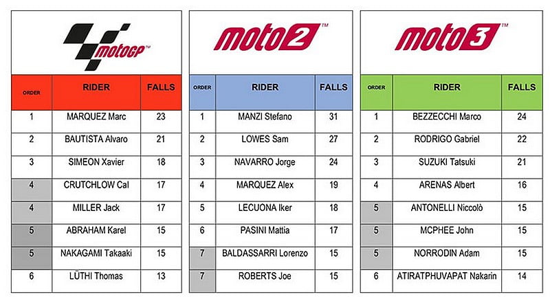 Toutes catégories confondues, c’est donc Stefano Manzi (Moto2, 31 chutes) qui a le plus chuté devant Sam Lowes (Moto2, 27 chutes), Marco Bezzecchi (Moto3, 24 chutes), Jorge Navarro (Moto2, 24 chutes) et Marc Márquez (MotoGP, 23 chutes).