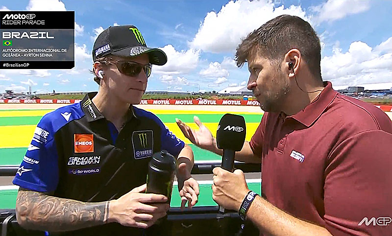 Nous sommes avec Fabio Quartararo. Bon, il est Français, mais il parle tellement de langues ! Le portugais, pas énormément, mais j’étais jeudi chez Yamaha et je vous ai entendu dire quelques mots en portugais. Ils vont comprendre, Fabio. Que savez-vous dire en portugais ? Parlez portugais ! Vous réalisez jusqu’ici un très bon week-end. Mais êtes-vous satisfait de ce qui s’est passé jusqu’à présent ?