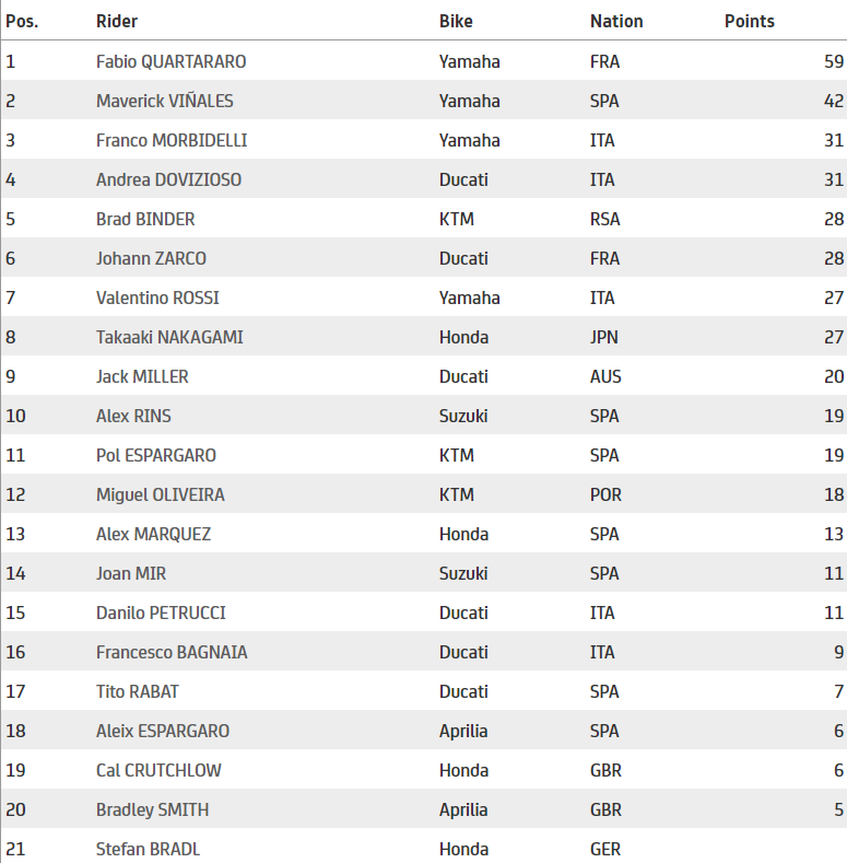 Fabio Quartararo mène donc la danse avec 59 points devant Viñales qui en compte 42 alors que Dovizioso en est à 31. Il voit Morbidelli s’installer exactement à ses côtés tandis que dans le top 5 déboulent Brad Binder, le rookie, et Johann Zarco le Phénix.