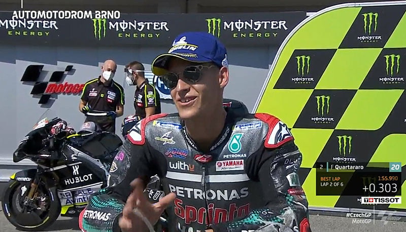 A peine descendu de sa Yamaha M1 du team satellite Petronas Yamaha SRT après avoir obtenu la deuxième place sur la grille de départ du Grand Prix de la République Tchèque à Brno, Fabio Quartararo s’est confié devant la caméra du site MotoGP.com avec la satisfaction d’avoir assuré la première ligne, mais sans doute aussi le sentiment qu’il aurait pu encore mieux faire sans les drapeaux jaunes…