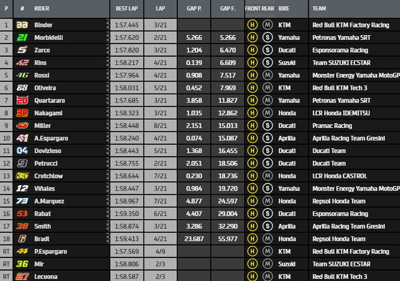 Aleix Espargaró : « Je suis content d’avoir terminé la course après ce qui s’est passé à Jerez, même si je ne peux pas être entièrement heureux. Brno est un circuit difficile pour nous. Je dirais que Brno et Spielberg ont été les circuits les plus difficiles pour nous ces trois dernières années. Vu de cette manière, le résultat est loin d’être un vrai désastre. Il nous manquait sept ou huit secondes pour nous battre pour la troisième place. Malheureusement, nous n’avons pas été aussi incisifs dans la course qu’aux qualifications. Je n’ai pas eu le rythme nécessaire pour rester avec les meilleurs et la moto ne tournait pas comme je voulais. Je m’attendais à pouvoir suivre les gars plus facilement pendant quelques tours. Mais ils avaient clairement une meilleure traction. J’étais bien au freinage mais je ne pouvais pas tout à fait suivre le groupe de tête. »