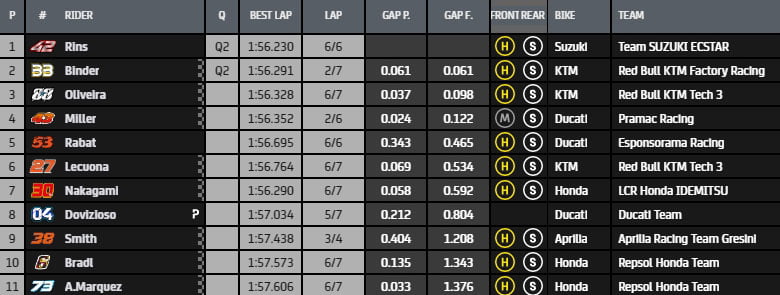 Rins claque un 1’56.230 devant Nakagami. Binder est recalé pur un millième… Mais il retrouve son rang puisque Nakagami se fait retirer son meilleur tour.  C’est un catastrophe pour Dovizioso : il s’élancera 18ème dimanche…