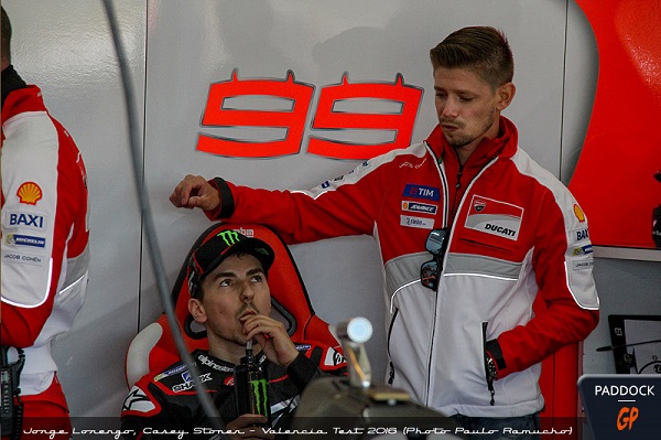 Jorge Lorenzo ne s’était pas encore imposé lorsque Casey Stoner a répondu aux questions, néanmoins lorsqu’on lui a demandé qui avait été le moins bon pilote sur la Ducati entre le Majorquin et Valentino Rossi, il savait déjà répondre : « Les choses sont différentes mais je dirais probablement Valentino car Jorge s’est battu plus de fois pour le podium et a mené des courses. Il a été en mesure d’être devant, mais cela reste difficile de vraiment choisir entre les deux. »