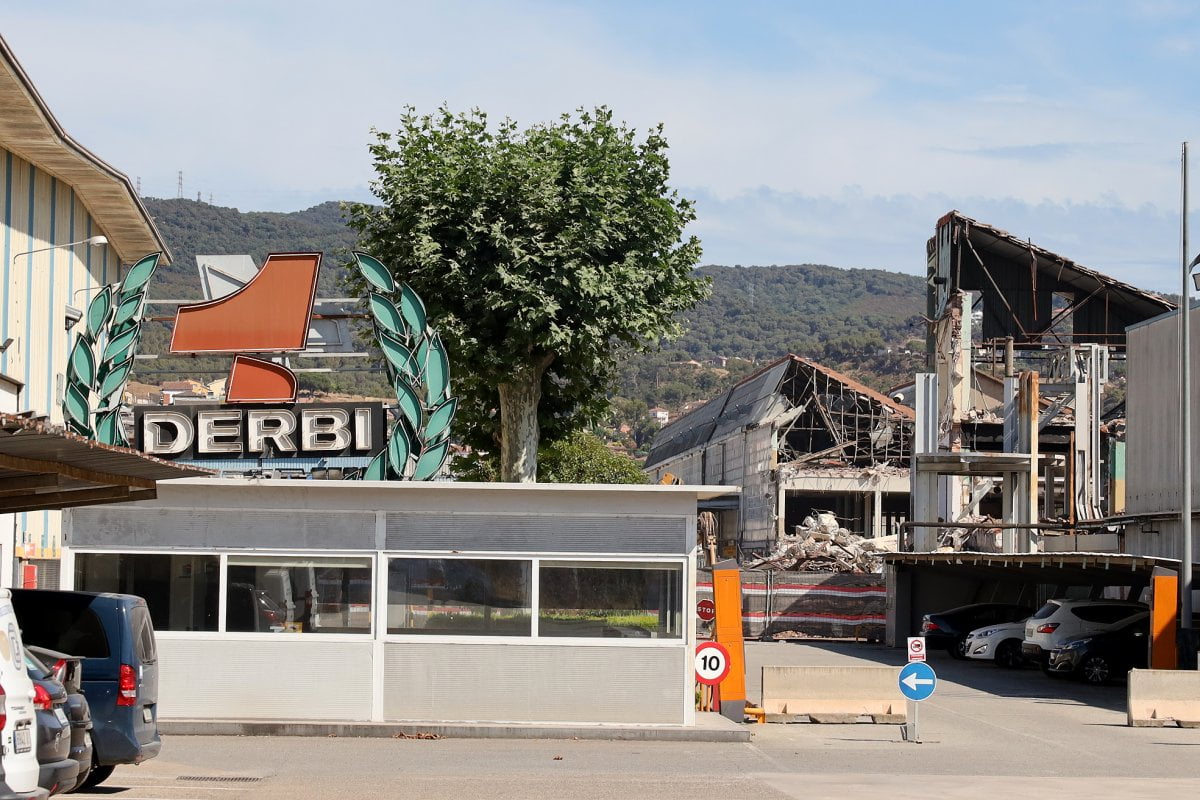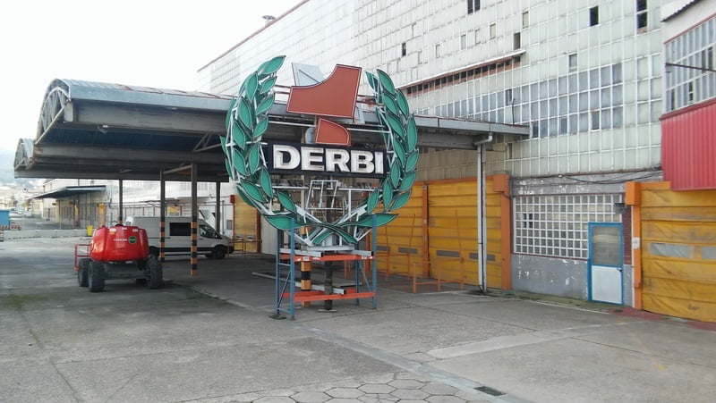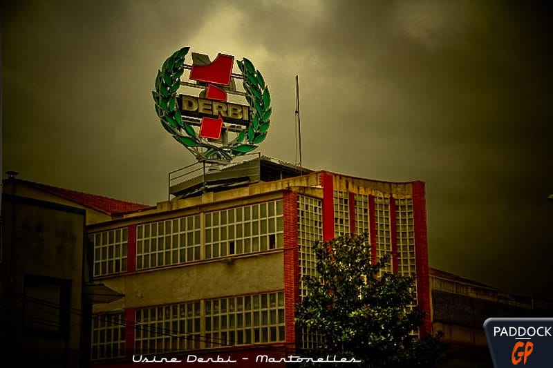 Du moins, jusqu’à l’an dernier où l’on pouvait encore admirer les énormes lettres DERBI et l’immense couronne de laurier trônant fièrement sur l’antique usine de la banlieue de Barcelone. On pouvait même s’approcher de celle-ci et voir à travers les vitres les ateliers déserts bien qu’encore éclairés, tout en imaginant les regrettés Ricardo Tormo et Angel Nieto faisant leurs essais dans les rues adjacentes, une coutume évidemment d’un autre temps…