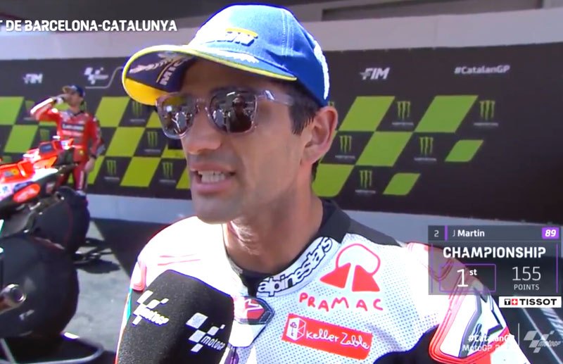 A peine descendu de sa Ducati GP24 du team Pramac Racing après terminé 2e du Grand Prix MotoGP de Catalogne à Barcelone, Jorge Martin s’est confié devant les caméras du site officiel MotoGP.com avec la satisfaction de voir le verre plus qu’à moitié plein dans l’optique du championnat…
