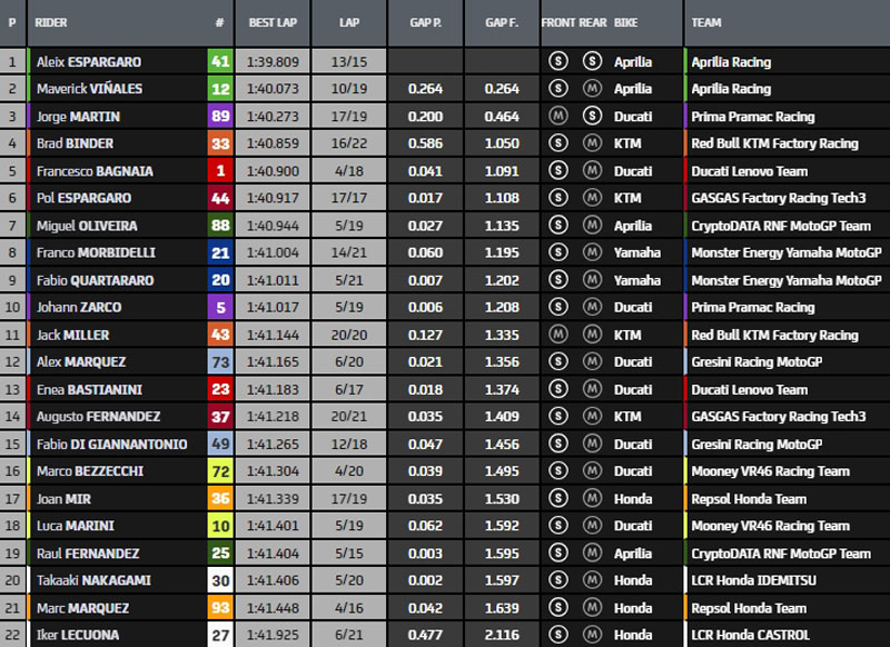 Alors que l’adhérence relative de la piste a également déjà causé quelques chaleurs à Marco Bezzecchi et Fabio Quartararo, le classement présente Aleix Espargaro, Maverick Vinales, Francesco Bagnaia, Miguel Oliveira, Jorge Martin, Fabio Quartararo, Johann Zarco, Alex Márquez, Enea Bastianini, Jack Miller, Brad Binder, Pol Espargaro, Marco Bezzecchi, Fabio Di Giannantonio, Augusto Fernandez, Luca Marini, Raul Fernandez, Takaaki Nakagami, Marc Márquez, Franco Morbidelli, Joan Mir, Iker Lecuona à la fin du premier run.