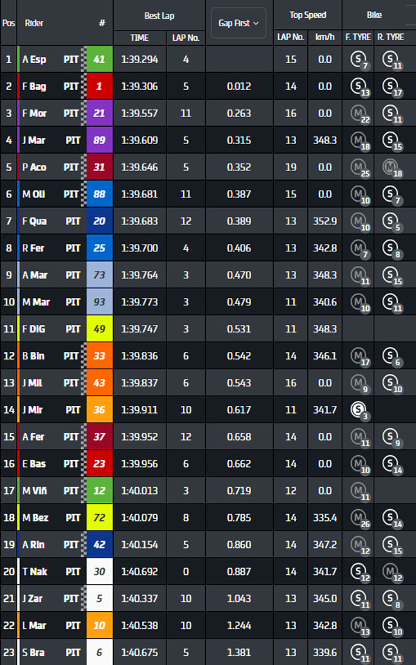 À la mi séance, quand la plupart des pilotes rentrent dans leur box, la hiérarchie est composée de Aleix Espargaro Espargaro, Francesco Bagnaia, Franco Morbidelli, Jorge Martin, Pedro Acosta, Raul Fernandez, Fabio Quartararo, Fabio Di Giannantonio, Alex Márquez, Marc Márquez, Brad Binder, Jack Miller, Miguel Oliveira, Enea Bastianini, Maverick Vinales, Marco Bezzecchi, Joan Mir, Alex Rins, Augusto Fernandez, Takaaki Nakagami, Johann Zarco, Luca Marini, Stefan Bradl.