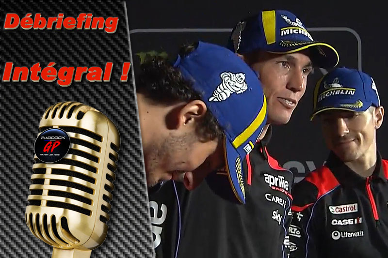 Aleix Espargaró : « Oui, très, très heureux ! C’était un sentiment très spécial quand j’ai franchi le drapeau à damier, même si ce n’est que le Sprint. Mais ce matin, c’était un peu amer parce que j’ai fini deuxième, ce qui est bien pour les deux courses, mais j’ai eu un peu l’impression d’avoir perdu. Vous savez, j’ai tout donné, mais Pecco était meilleur, le record du tour incroyable, et j’étais un peu en colère. Je me suis donc engagé à fond dans le Sprint. J’ai été un peu choqué au début des 2 premiers tours, parce que le niveau proposé par Pecco était très élevé. En petit 39, c’était un rythme très, très élevé et ce n’était pas dans mes plans d’aller à ce rythme. Alors quand il a commencé à pousser comme ça, je me suis dit : « OK, jouons. Voyons qui peut aller plus vite, voyons qui va détruire le pneu arrière en premier ». Et oui, aujourd’hui j’ai gagné (rires). »