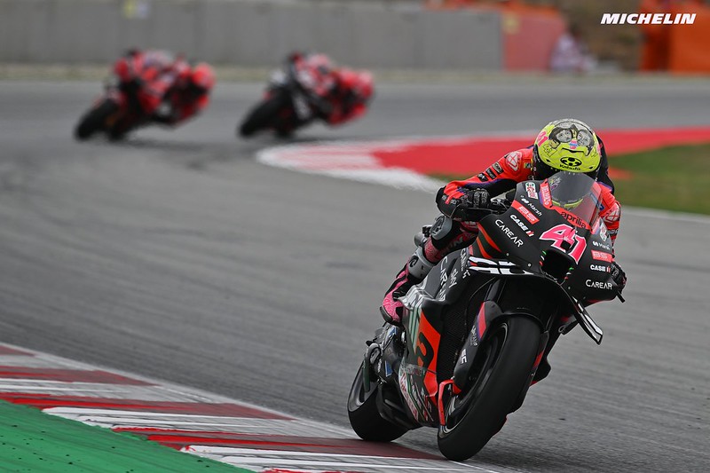 « Oui, je suis d’accord. Pecco a raison. Mais Pecco roule en ce moment à un très haut niveau. Je pense qu’aujourd’hui la pole position de Pecco prouve que…. nous avons toujours tendance à ne pas valoriser le travail acharné des pilotes : s’il ne fait pas de bons résultats, la moto est merdique, s’il fait de bons résultats, c’est qu’il a la meilleure moto. Pas toujours ! J’étais très en colère pour la pole position parce que je sais que j’avais une meilleure moto que Pecco ici, et il a battu le record du tour. C’est très bien pour lui, mais j’étais un peu en colère contre moi-même. Donc vous savez, il est clair que sur un circuit comme Barcelone, la traction de l’Aprilia et surtout la vitesse que nous pouvons atteindre dans les virages rapides est supérieure à celle des Ducati. Nous devons donc travailler sur les autres circuits, et comme Pecco vient juste de le dire, ils s’améliorent beaucoup au niveau du freinage. Je pense que c’est quelque chose que nous devons améliorer chez Aprilia, mais sur ce type de circuit, nous sommes la référence. »