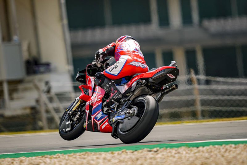 « La différence entre les deux motos ? La V4 S a un très bon couple. C’est très agréable et elle a un couple vraiment proche de la MotoGP, dont vous pouvez avoir un bon feeling avec le moteur en V. Vous avez aussi une bonne puissance mais vous n’aurez jamais la puissance d’une MotoGP. Ce qui est parfois difficile en pilotage, c’est que nous vous ne pouvez pas freiner comme vous freinez en MotoGP, et vous ne pouvez pas pousser l’avant comme vous pouvez le faire sur une MotoGP. Peut-être que comme j’ai fait beaucoup de Moto2 et de motos de série, je m’adapte bien à ce genre de feeling, alors que d’autres qui ne pilotent que des MotoGP détestent ce feeling avec l’avant quand ils pilotent des motos de série. Je pense que c’est là où nous perdons, environ 4,5 ou 5 secondes entre une MotoGP et une moto de série. Maintenant, nous pouvons voir qu’un avant solide est important, car les Moto2 vont maintenant beaucoup plus vite que les motos de série. Avec les vieilles Moto2, une moto de série pouvait être proche ou plus rapide, mais maintenant avec les nouvelles Moto2 on ne peut plus car nous sommes limités par la moto de série. »