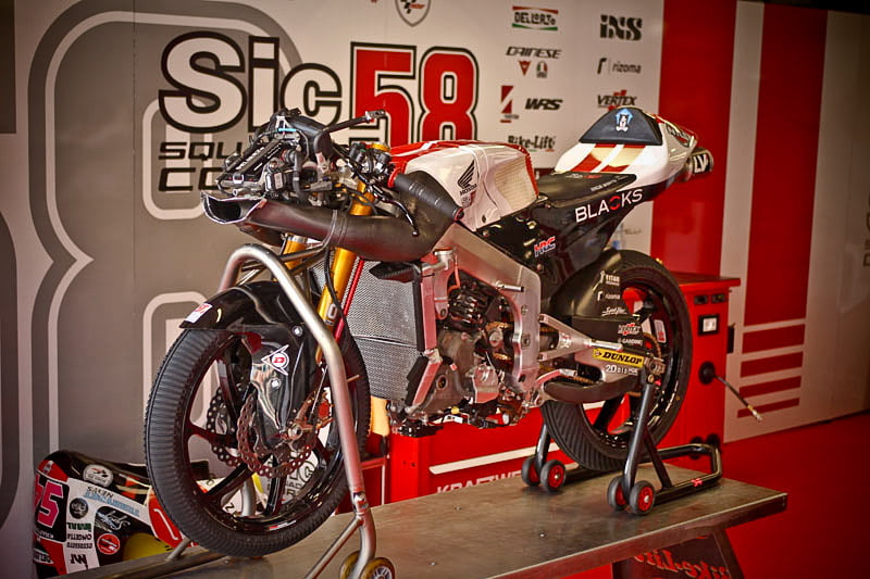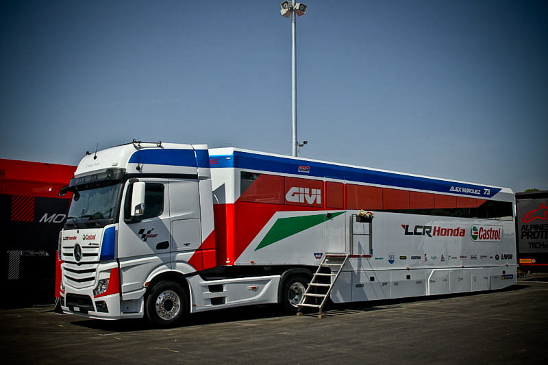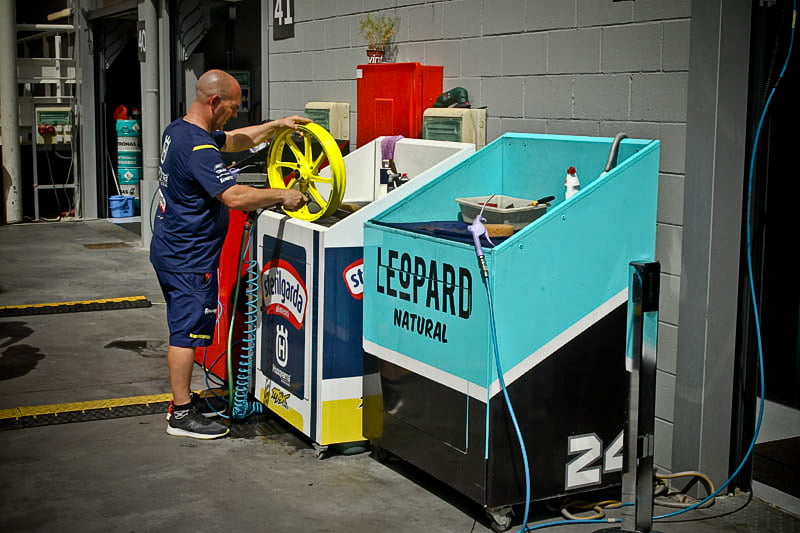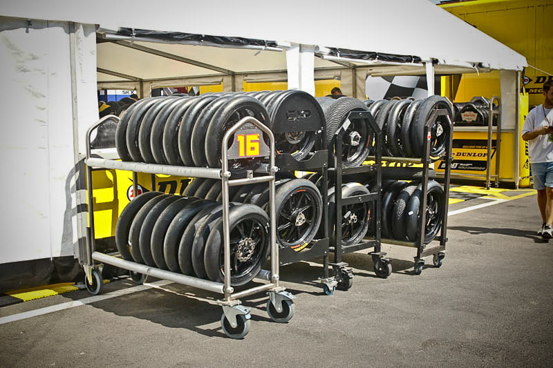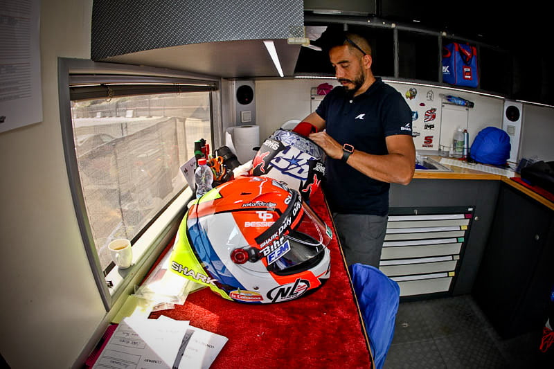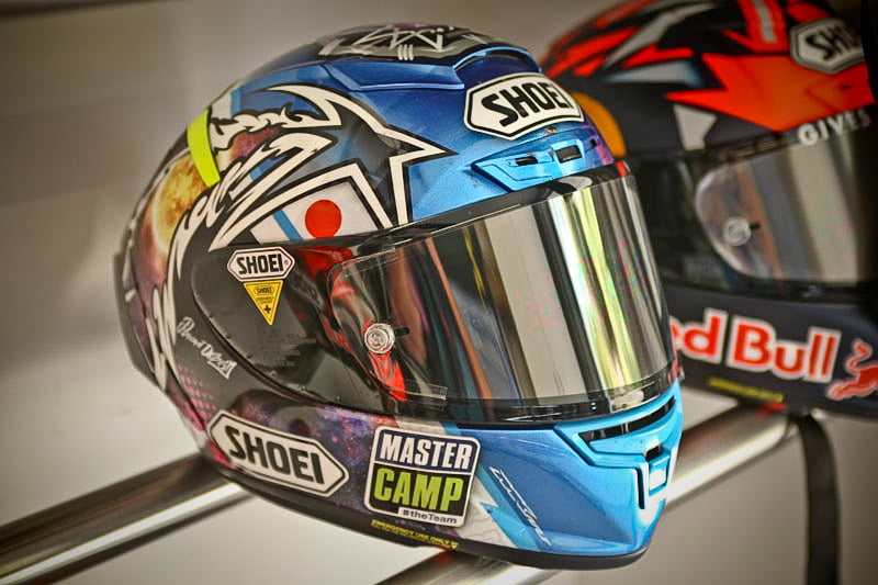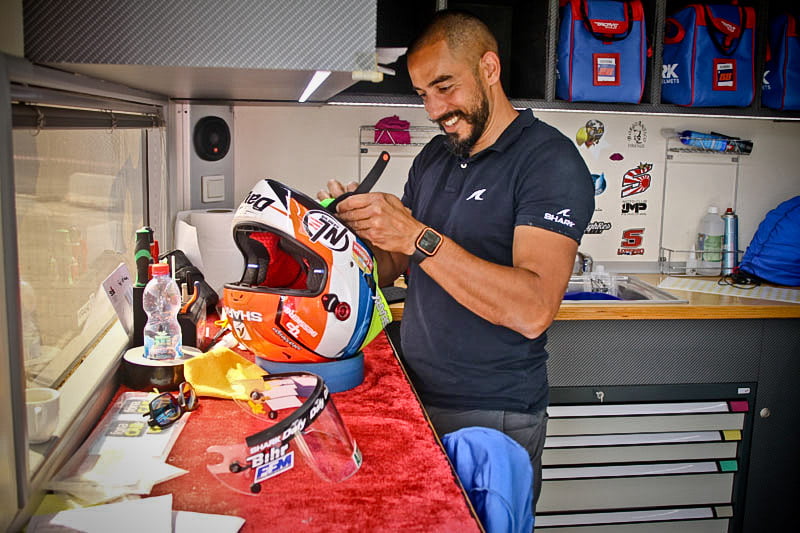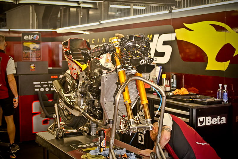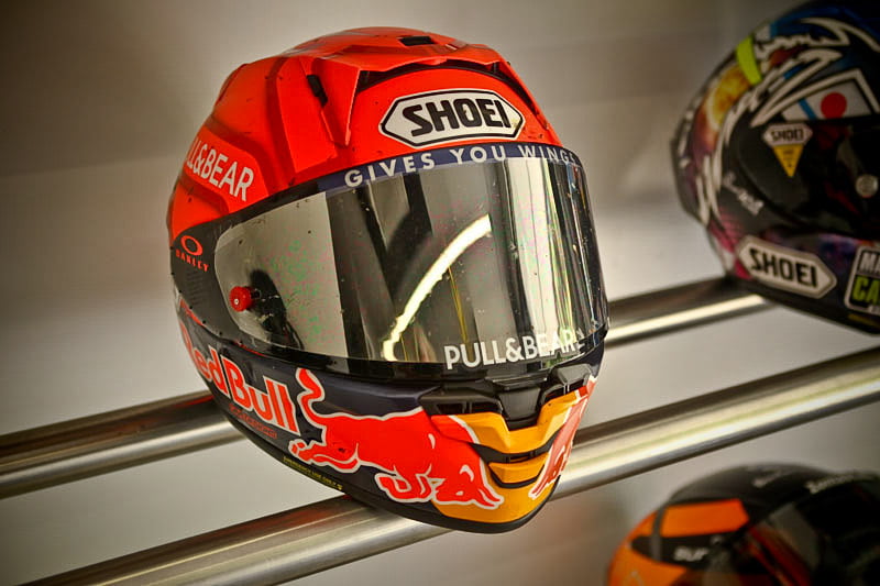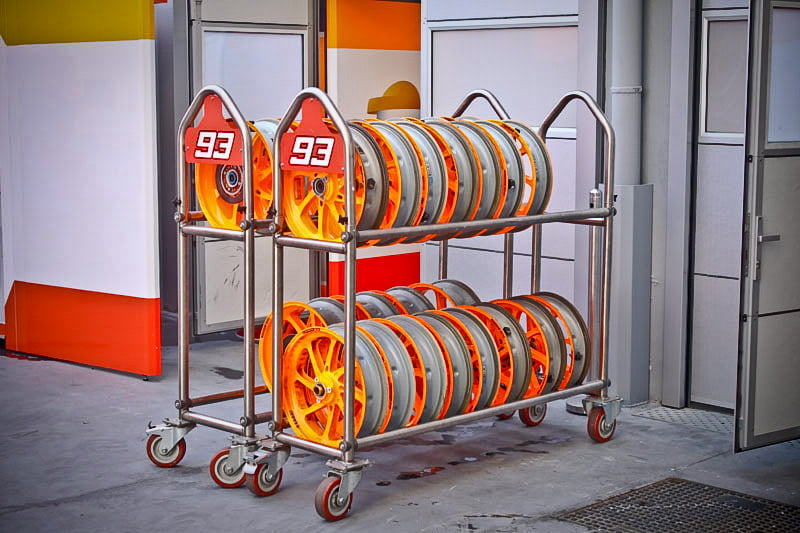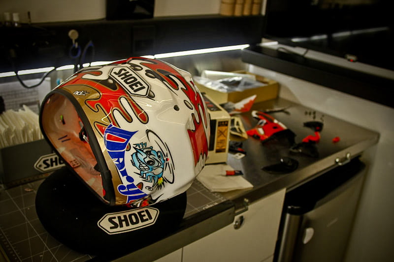 Tout cela va rapidement se transformer en une fourmilière qui grossira au fil des jours mais, en attendant, certaines images saisies par l’objectif de notre photographe Christian Bourget sont assez poignantes, comme les jantes de Marc Marquez sans pneus ou son casque posé sur une étagère du Racing Service Shoei…