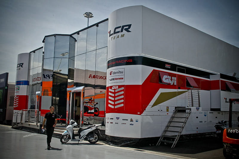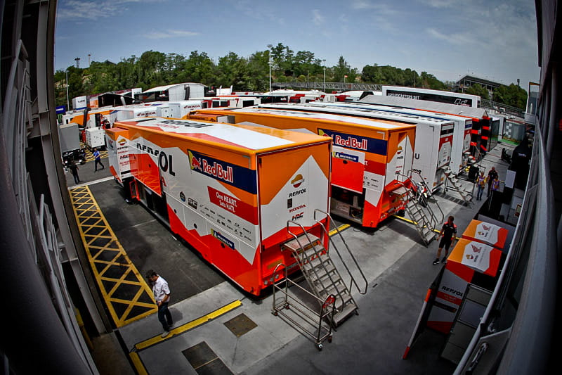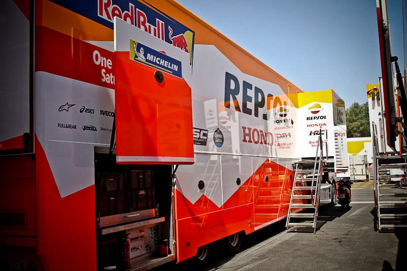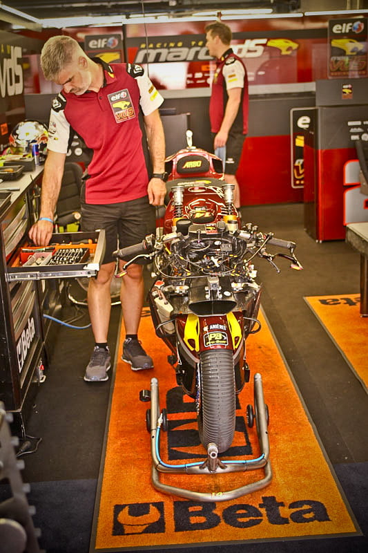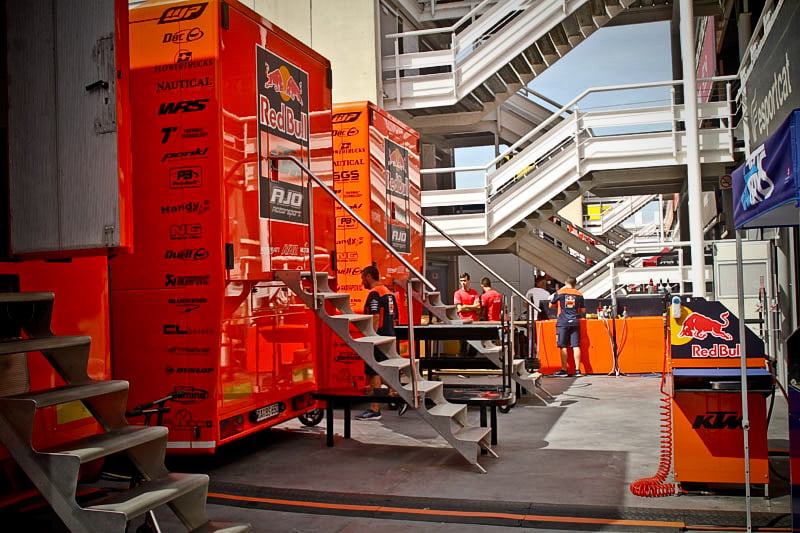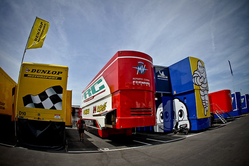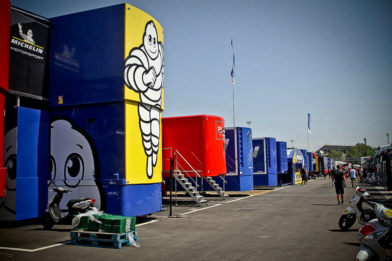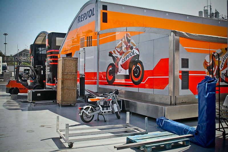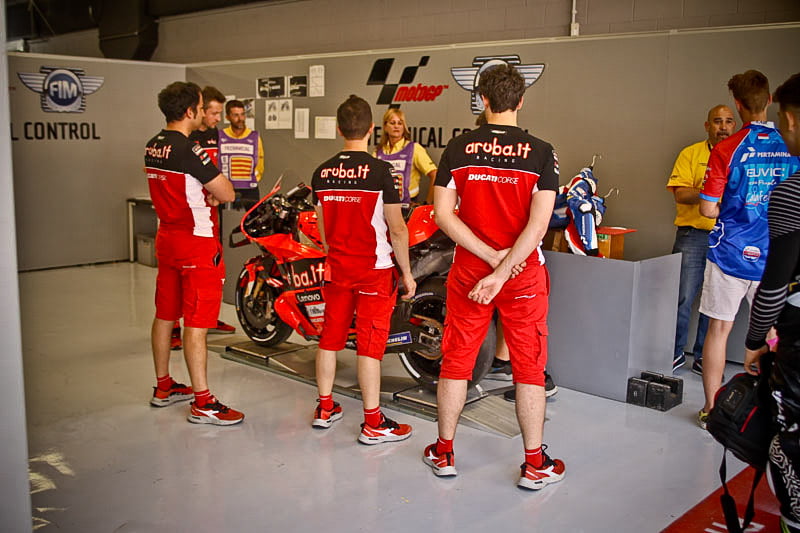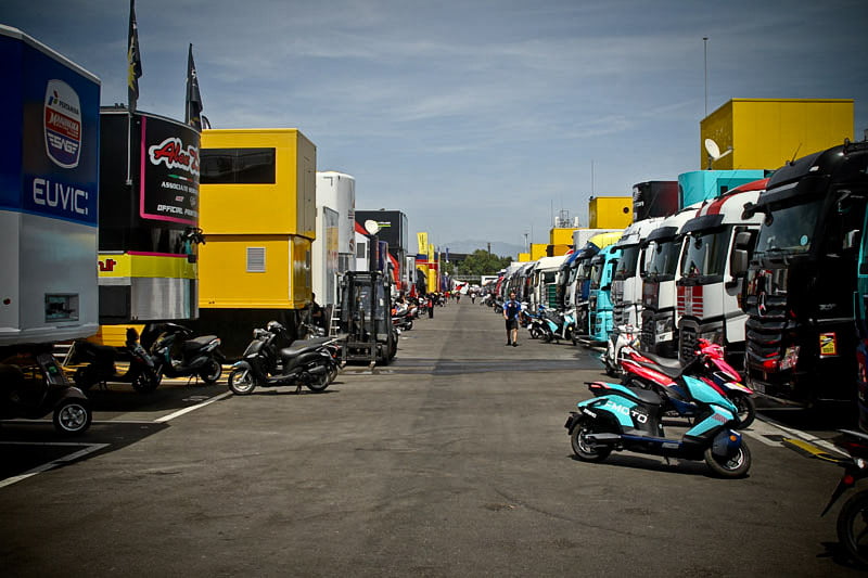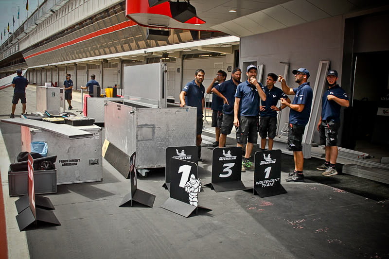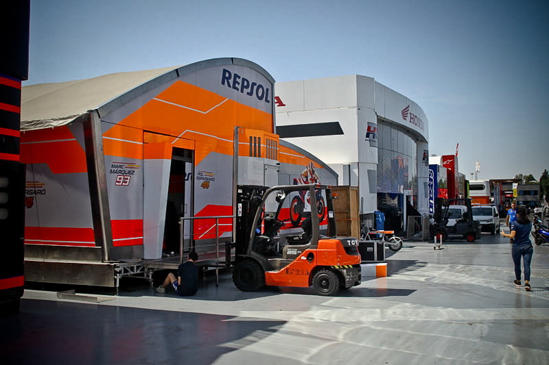 On est à ce moment charnière où la cohue de l’installation des hospitalités a quasiment cessé et où pilotes et journalistes sont encore en train de se diriger vers le circuit. Dans les box, on termine les motos, le plus souvent volets roulants baissés. Les tribunes sont bien entendu vides et l’endroit le plus animé de la pit lane, quasiment déserte, est le contrôle technique.