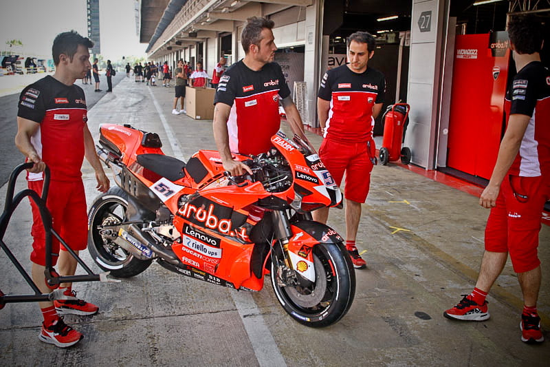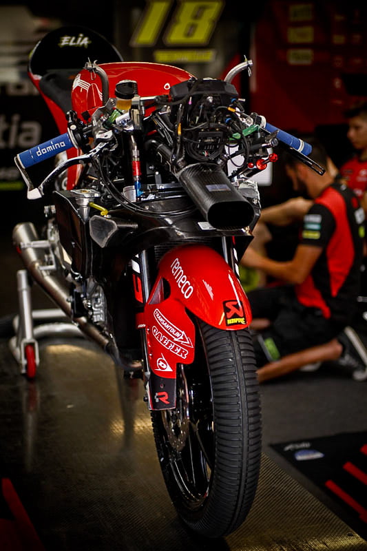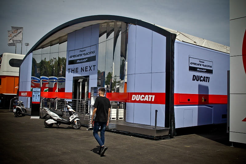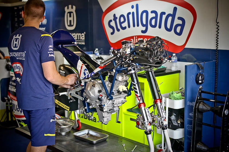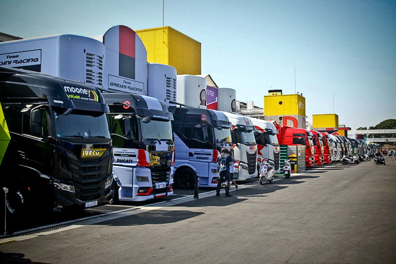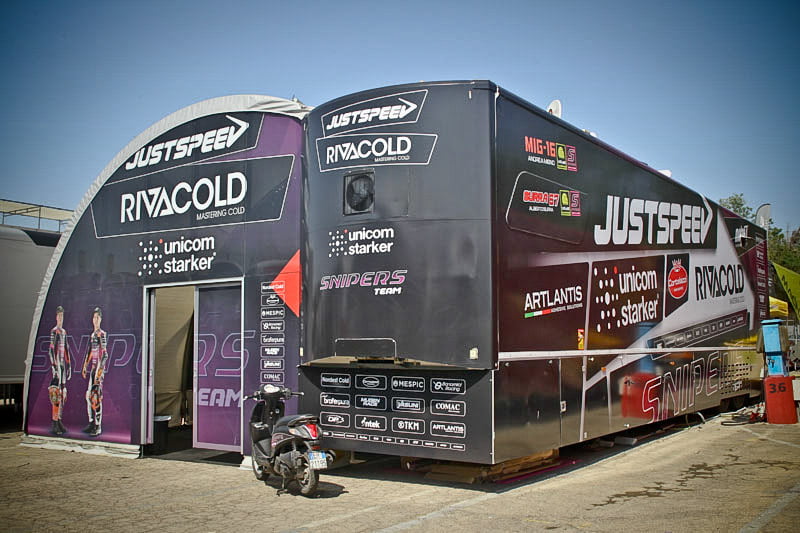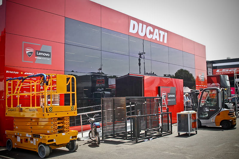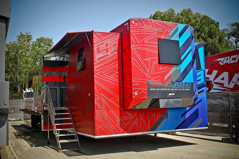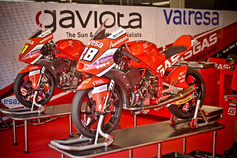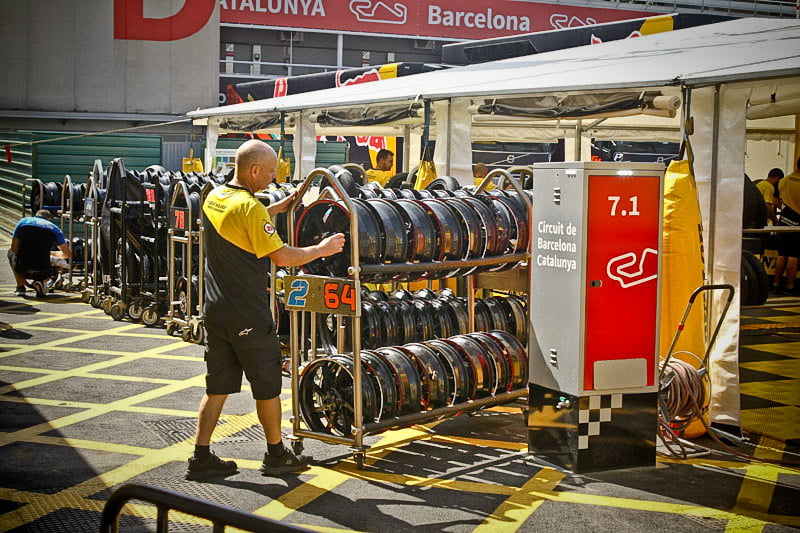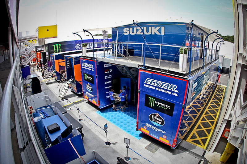On est à ce moment charnière où la cohue de l’installation des hospitalités a quasiment cessé et où pilotes et journalistes sont encore en train de se diriger vers le circuit. Dans les box, on termine les motos, le plus souvent volets roulants baissés. Les tribunes sont bien entendu vides et l’endroit le plus animé de la pit lane, quasiment déserte, est le contrôle technique.
