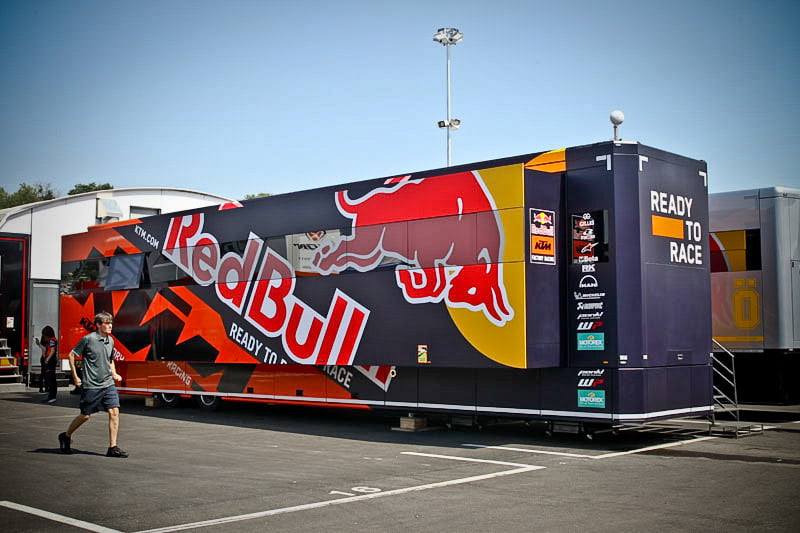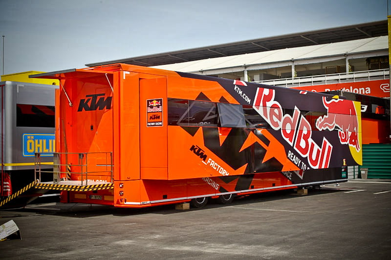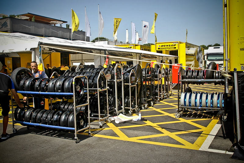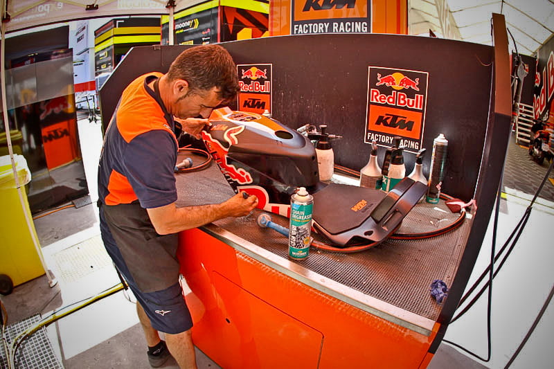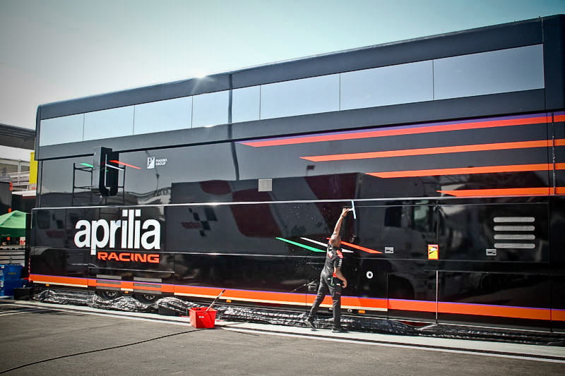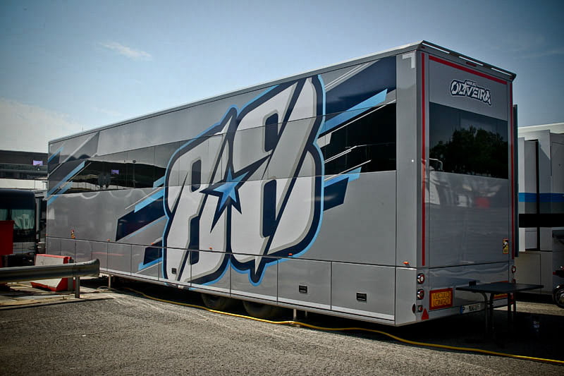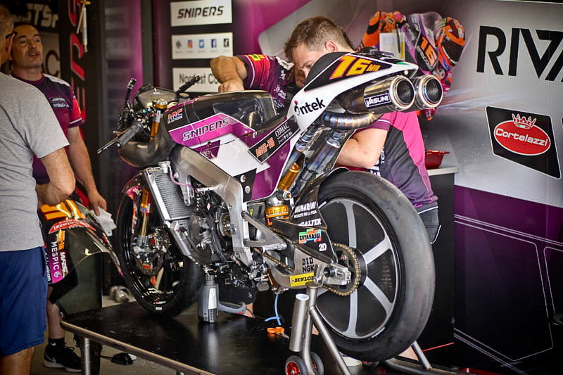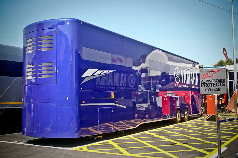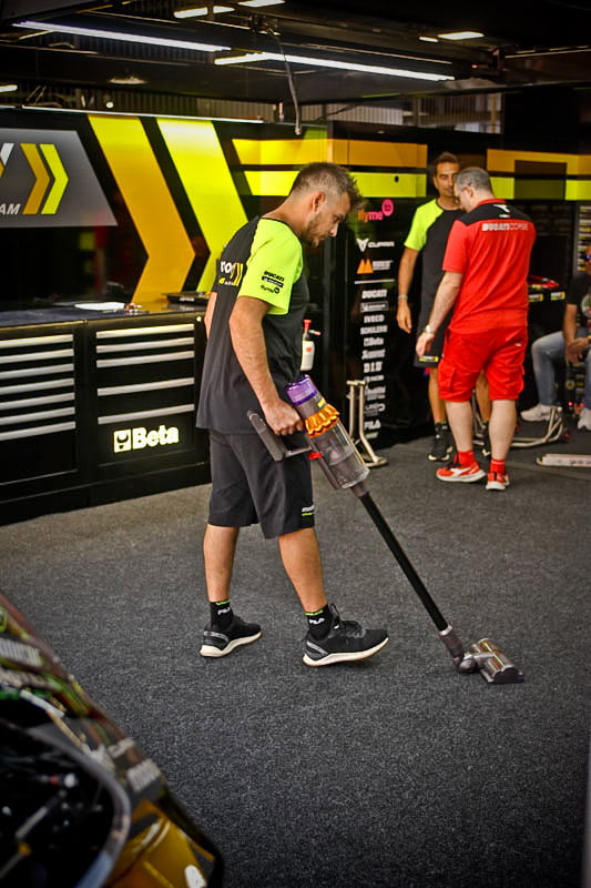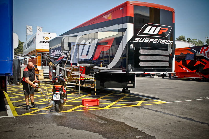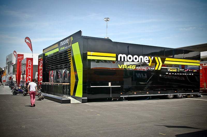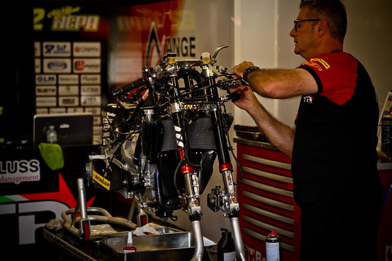 On est à ce moment charnière où la cohue de l’installation des hospitalités a quasiment cessé et où pilotes et journalistes sont encore en train de se diriger vers le circuit. Dans les box, on termine les motos, le plus souvent volets roulants baissés. Les tribunes sont bien entendu vides et l’endroit le plus animé de la pit lane, quasiment déserte, est le contrôle technique.