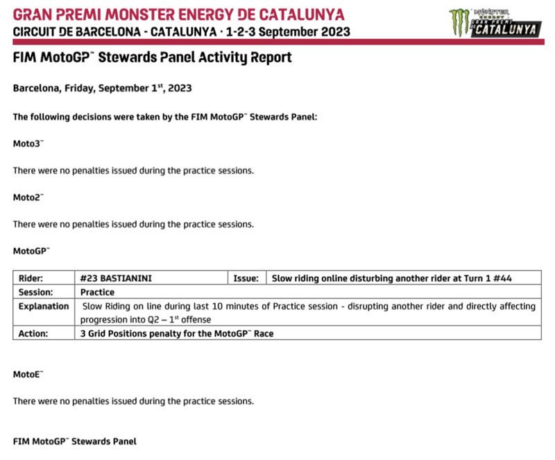 Le nouveau système mis en place par les autorités du MotoGP fonctionne bien et, pour ce Grand Prix de Catalogne, c’est Enea Bastianini qui a le triste privilège d’inaugurer les sanctions de la catégorie reine.
