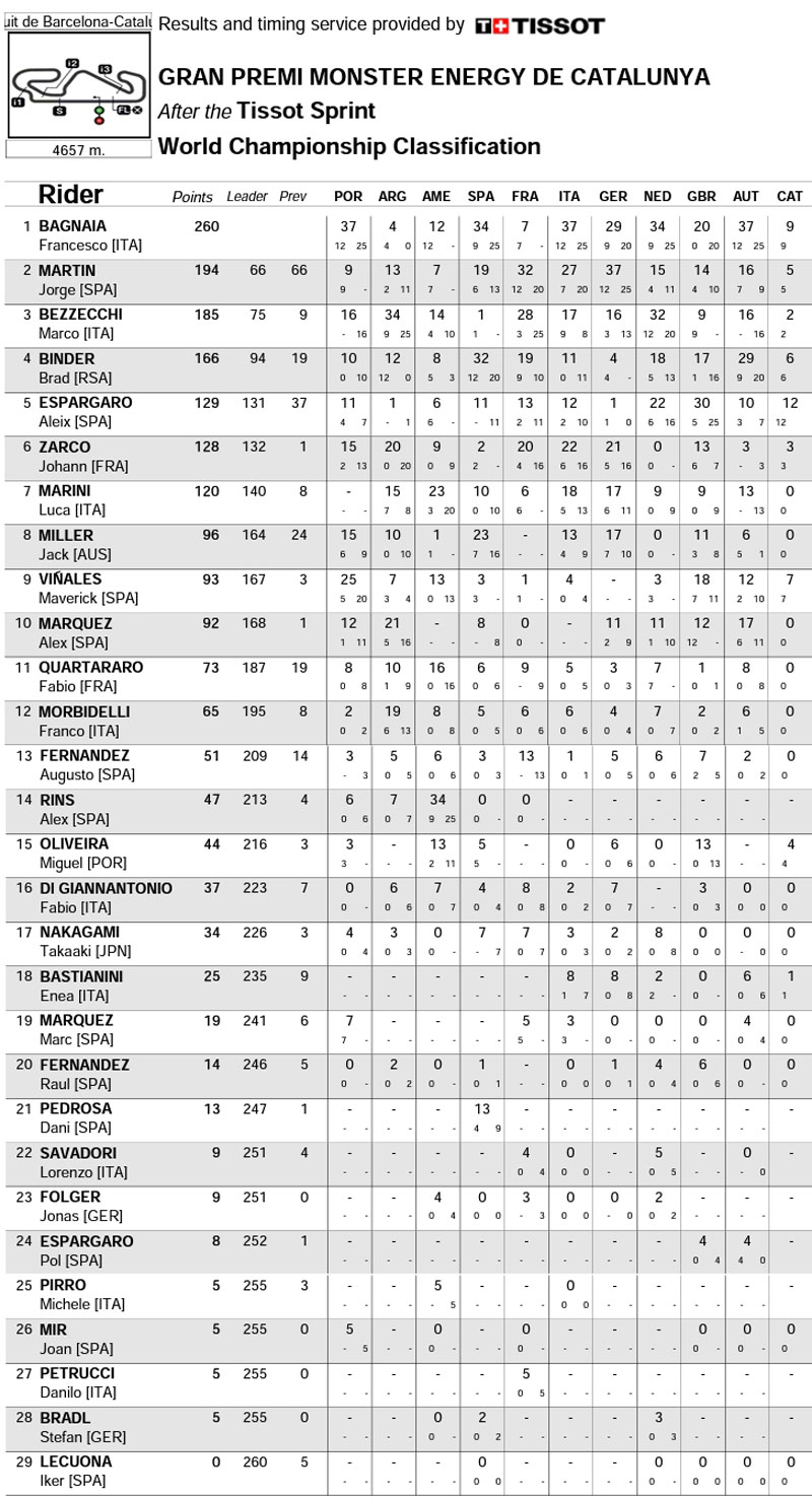 Aussi minimes soient-elles, le Sprint du Grand Prix de Catalogne sur le circuit de Barcelone a entraîné son lot de modifications au classement du championnat du monde MotoGP.