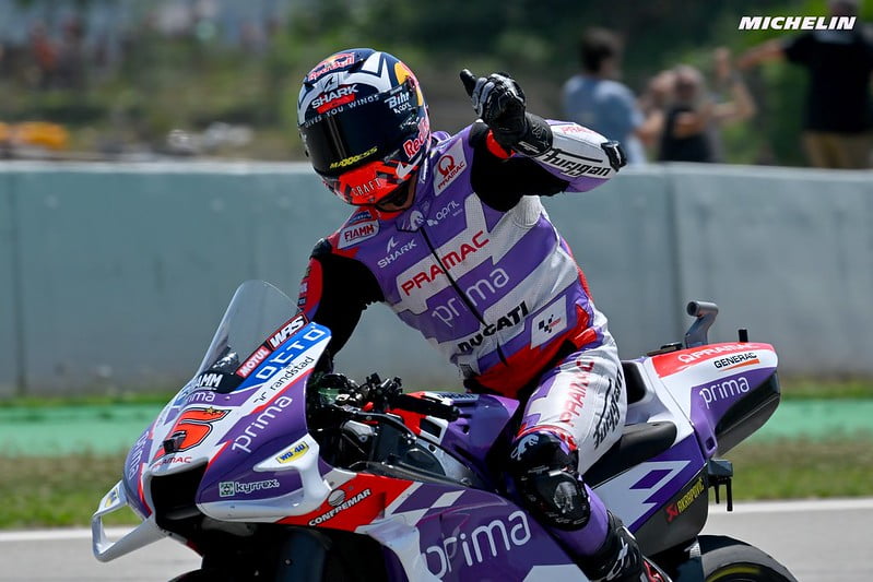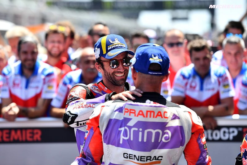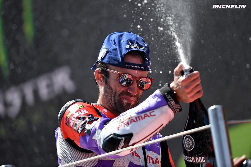 « Oui, j’ai vraiment pensé qu’il allait se battre de nouveau, mais j’ai vu sur la vidéo qu’il avait pris beaucoup de temps pour réaliser que la course n’était pas terminée. Je peinais énormément avec le pneu arrière, donc dans le dernier tour j’ai essayé d’être rapide et de resserrer les trajectoires pour le bloquer, car je ne savais pas où il était. Quant à la concentration, Jorge Martin m’a aidé car j’avais un doute pour savoir si la course était terminée ou pas, et quand j’ai vu Jorge continuer à attaquer, je me suis dit « même si c’est terminé, je continue à attaquer aussi » (rires). Peut-être que si j’avais vu aussi Fabio célébrer… (rires). Peut-être que pendant le freinage j’ai perdu un peu de concentration, mais dans le virage trois j’étais de retour. »