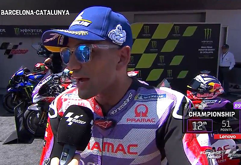 A peine descendu de sa Ducati GP22 du team satellite Prima Pramac Racing après avoir obtenu la 2e place du Grand Prix de Catalogne sur le circuit de Catalunya-Barcelona, Jorge Martín s’est confié devant les caméras du site officiel MotoGP.com avec la joie d’avoir reçu un petit coup de pouce inespéré……