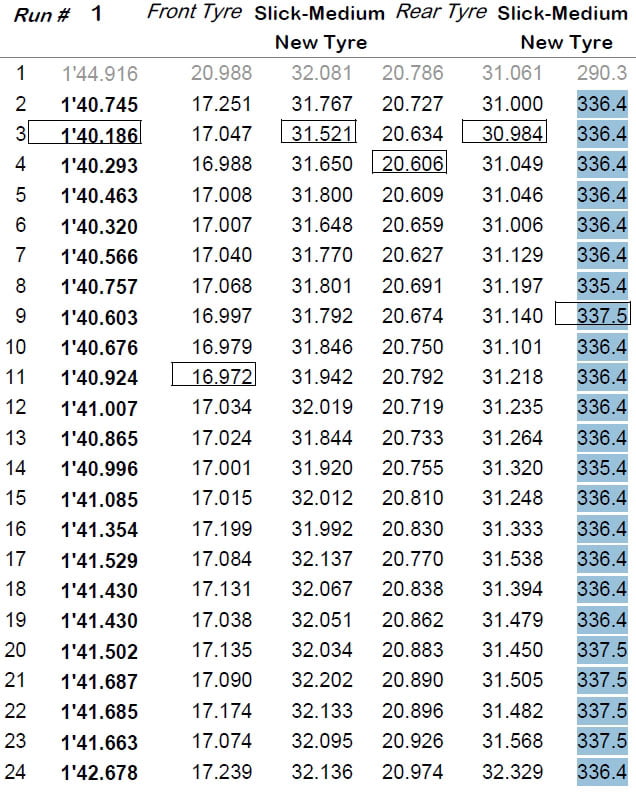 On constate qu’à l’exception du premier tour de lancement et du dernier tour dans lequel le pilote Yamaha quelque peu relâché son effort, la courbe est quasiment rectiligne, avec un écart entre le tour le plus rapide (réalisé au troisième passage) et l’avant-dernier tour d’environ une seconde et demie, phénomène dû à l’usure de pneumatiques.