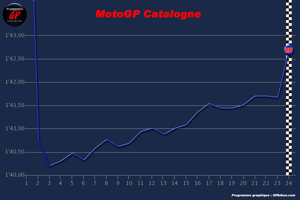 On constate qu’à l’exception du premier tour de lancement et du dernier tour dans lequel le pilote Yamaha quelque peu relâché son effort, la courbe est quasiment rectiligne, avec un écart entre le tour le plus rapide (réalisé au troisième passage) et l’avant-dernier tour d’environ une seconde et demie, phénomène dû à l’usure de pneumatiques.