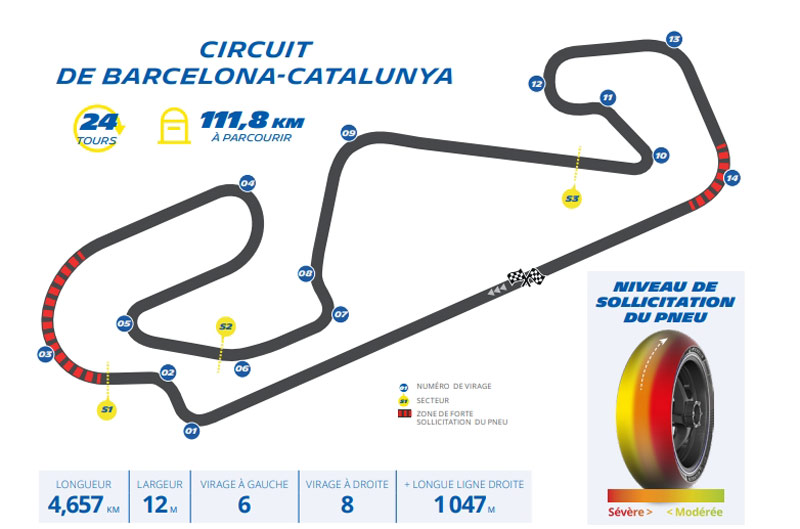 Sur le circuit de Barcelone-Catalunya, les partenaires de Michelin auront à disposition des crans de gomme Soft, Medium et Hard pour la roue avant, et Soft et Medium pour l’arrière. C’est ainsi qu’ils pourront dompter et tenter de battre les records établis sur un développé de 4,627 km. Avec six virages à gauche et huit à droite, mais aussi une ligne droite de 1 047 m pour une largeur de 12 m, les pilotes du MotoGP pourront s’exprimer en toute quiétude grâce aux performances équilibrées des pneumatiques Michelin.