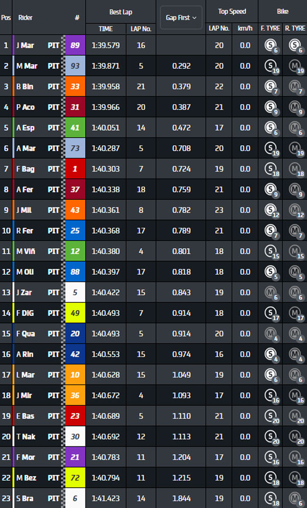 Au passage suivant, le pilote sud-africain prend l’avantage en 1’39.503 devant son coéquipier, suivi de Fabio Quartararo, Jorge Martin et Augusto Fernandez.