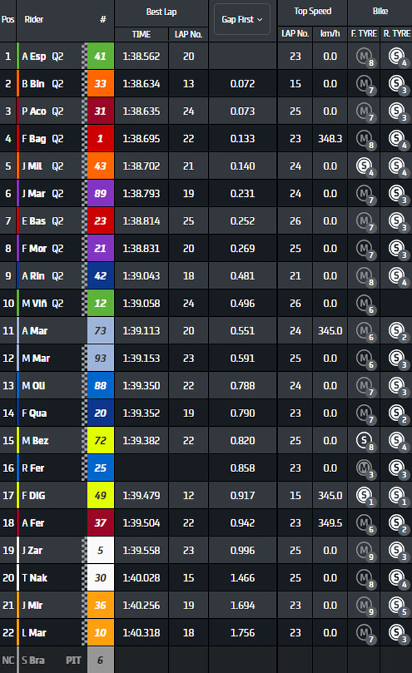 Au final, Aleix Espargaro, Brad Binder, Pedro Acosta, Francesco Bagnaia, Jack Miller, Jorge Martin, Enea Bastianini, Franco Morbidelli, Alex Rins et Maverick Viñales accèdent directement à la Q2 à l’inverse de Marc Márquez et Fabio Quartararo.