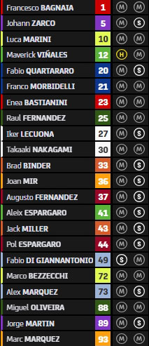 Aleix Espargaro, Maverick Vinales, Francesco Bagnaia, Johann Zarco, Brad Binder, Alex Márquez, Marco Bezzecchi, Fabio Di Giannantonio, Enea Bastianini et Jorge Martin sont donc pré-qualifiés directement pour la Qualification-2, contrairement à leurs petits camarades qui devront d’abord se départager en Qualification-1.