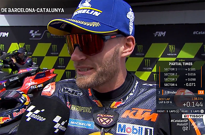 A peine descendu de sa KTM RC16 officielle après avoir obtenu la 3e place lors des qualifications du Grand Prix MotoGP de Catalogne à Barcelone, Brad Binder s’est confié devant les caméras du site officiel MotoGP.com avec la satisfaction d’avoir effacé aujourd’hui ses deux chutes de la veille et sa qualification au Mans…