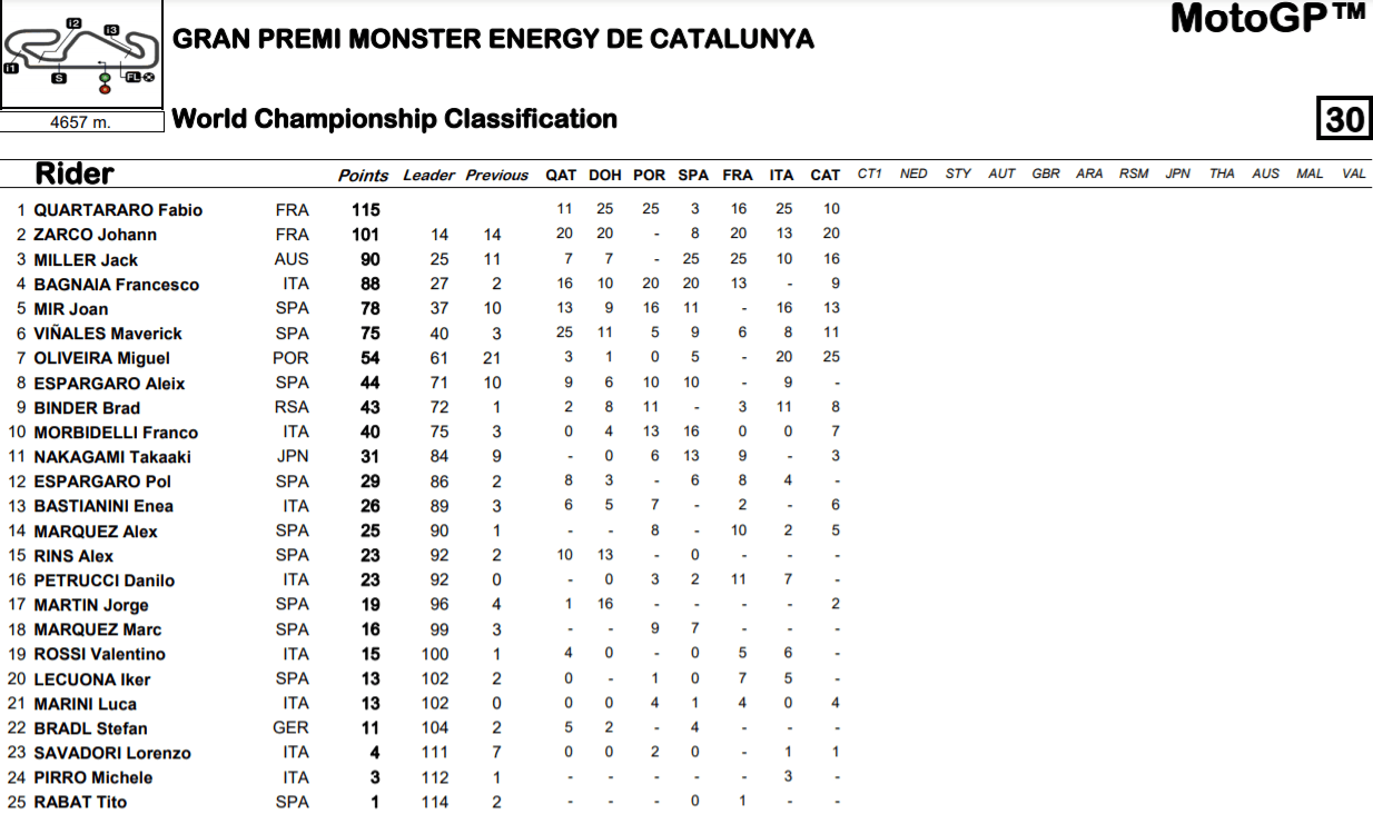 Pour finir, Fabio Quartararo, au reçu de sa pénalité, a commenté dans une story Instagram : « Félicitations à toutes les personnes qui sont allés se plaindre pour une pénalité supplémentaire. Je n’ai mis personne en danger, et il était déjà suffisamment difficile pour moi de piloter. Mais super de voir la vraie face de certaines personnes. Je tiens juste à remercier tous les gens qui me soutiennent et qui m’aident dans ces moments difficiles. On se voit à la prochaine. » Pourtant, si la Direction de Course avait été bien réveillée et avait scrupuleusement appliqué le règlement, c’est un drapeau noir avant l’arrivée que le Français aurait reçu. Synonyme de zéro point au championnat.