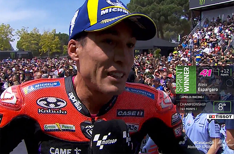 A peine descendu de son Aprilia RS-GP 24 officielle après avoir remporté le Sprint du Grand Prix MotoGP de Catalogne à Barcelone, Aleix Espargaro s’est confié devant les caméras du site officiel MotoGP.com avec la joie immense de vivre, comme il le dit, un véritable conte de fée…