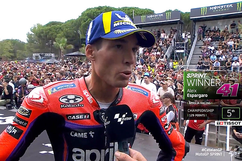 A peine descendu de son Aprilia RS-GP officielle après avoir remporté le Sprint du Grand Prix MotoGP de Catalogne à Barcelone, Aleix Espargaro s’est confié devant les caméras du site officiel MotoGP.com avec la joie de gagner à domicile…
