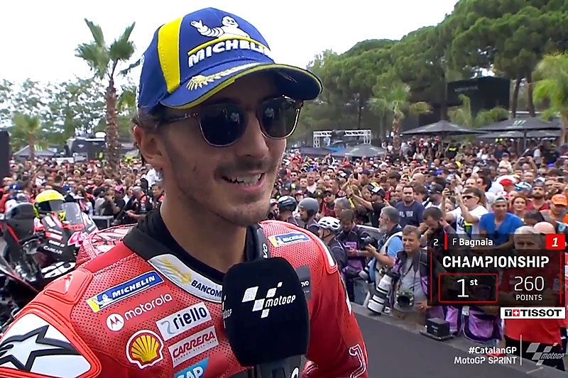 A peine descendu de sa Ducati GP23 officielle après avoir terminé 2e du Sprint du Grand Prix MotoGP de Catalogne à Barcelone, Francesco Bagnaia s’est confié devant les caméras du site officiel MotoGP.com avec la satisfaction de continuer à augmenter son avance au championnat…